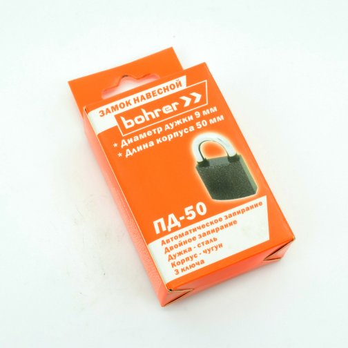 Замок навесной Bohrer ПД-50 (дужка сталь 9 мм, 3 ключа) (корпус чугун, резин. накладки на дужке) (с